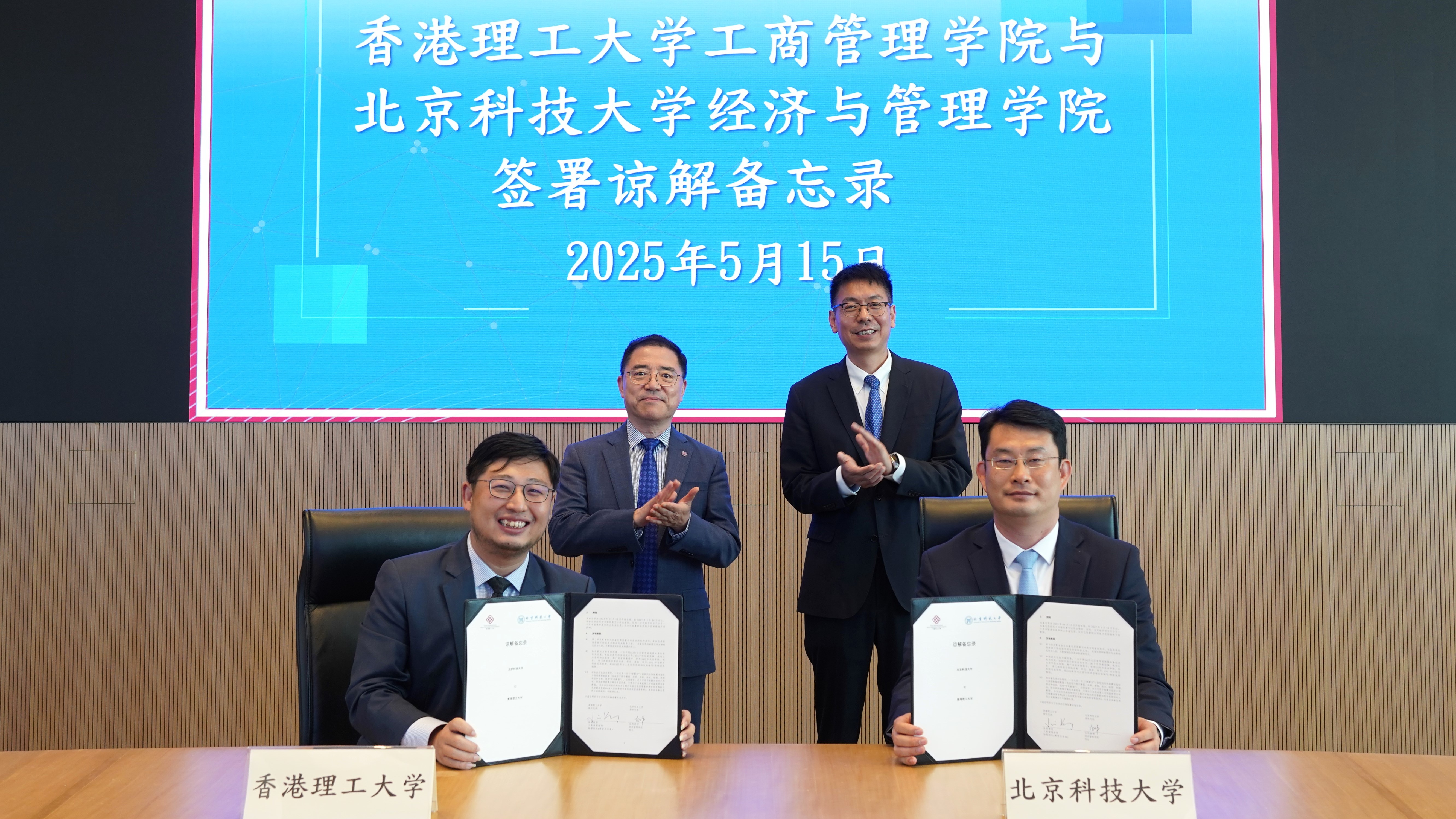 谷炜代表学院与香港理工大学工商管理学院签署谅解备忘录。学院与香港理工大学工商管理学院自2024年起即建立了合作意向。2024年10月,学院领导率团访问香港理工大学,明确合作方向和内容。2025年2月,香港理工大学工商管理学院郑大昭院长访问我院,双方进一步落实合作细节。