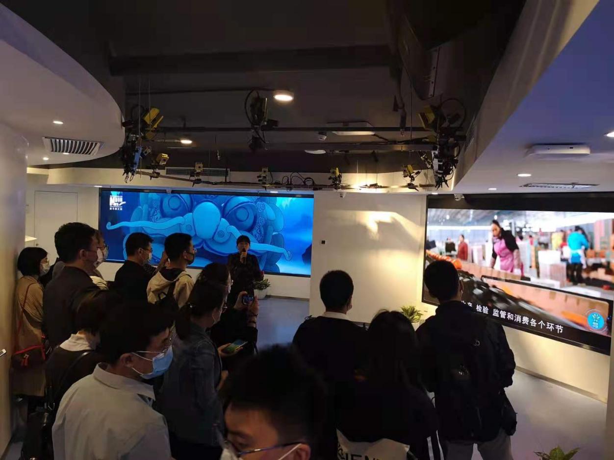 参观活动分为科技展厅和新媒体创新工场两个部分。首先企业向导带领大家参观了科技展厅。最先映入眼帘的是面科技感十足的情绪墙,向导通过分享一个曾经的实验,借助生物传感的核心前沿技术,给参观者佩戴小模具,并利用多模态的方式结合后台算法,最终以数据的形式展示出不同人对信息感兴趣的程度。这项生物传感技术可应用于传媒中的影视广告效果评测、教育效果的评估,以及汽车科技领域中对于疲劳驾驶的智能安全提醒等多方面。