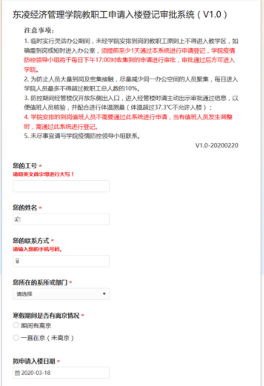 关于经管楼实施封闭管理的紧急通知》和学院疫情防控领导小组的要求,自2月20日起,上线学院教职工申请入楼登记审批系统,所有涉及教职工入楼的申请均在线流转审批,提高申请审批效率,做到定点通知审批结果,严格控制入楼人员数量,避免教职员工大范围聚集,切实降低疫情传播风险。