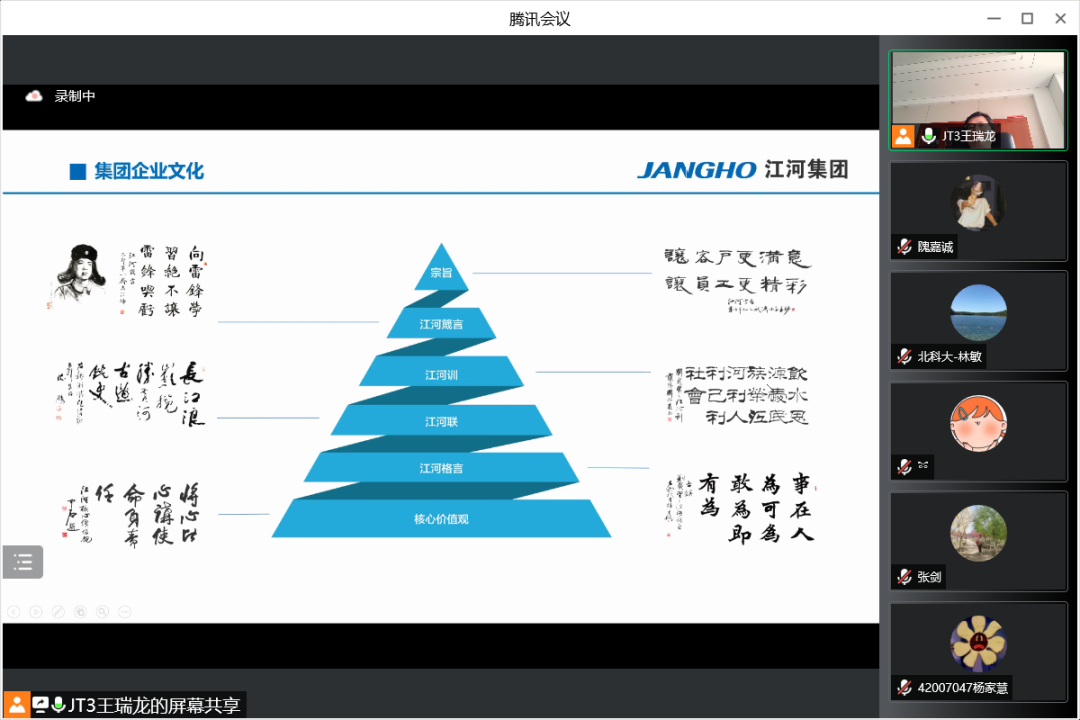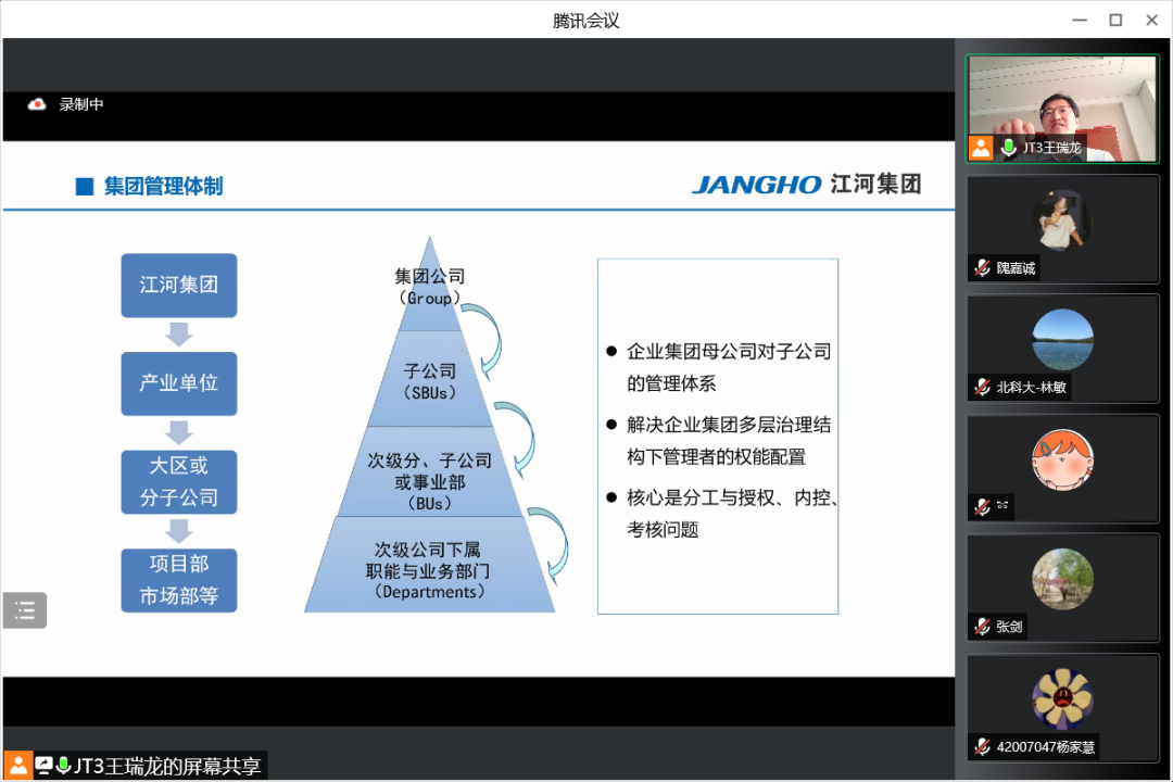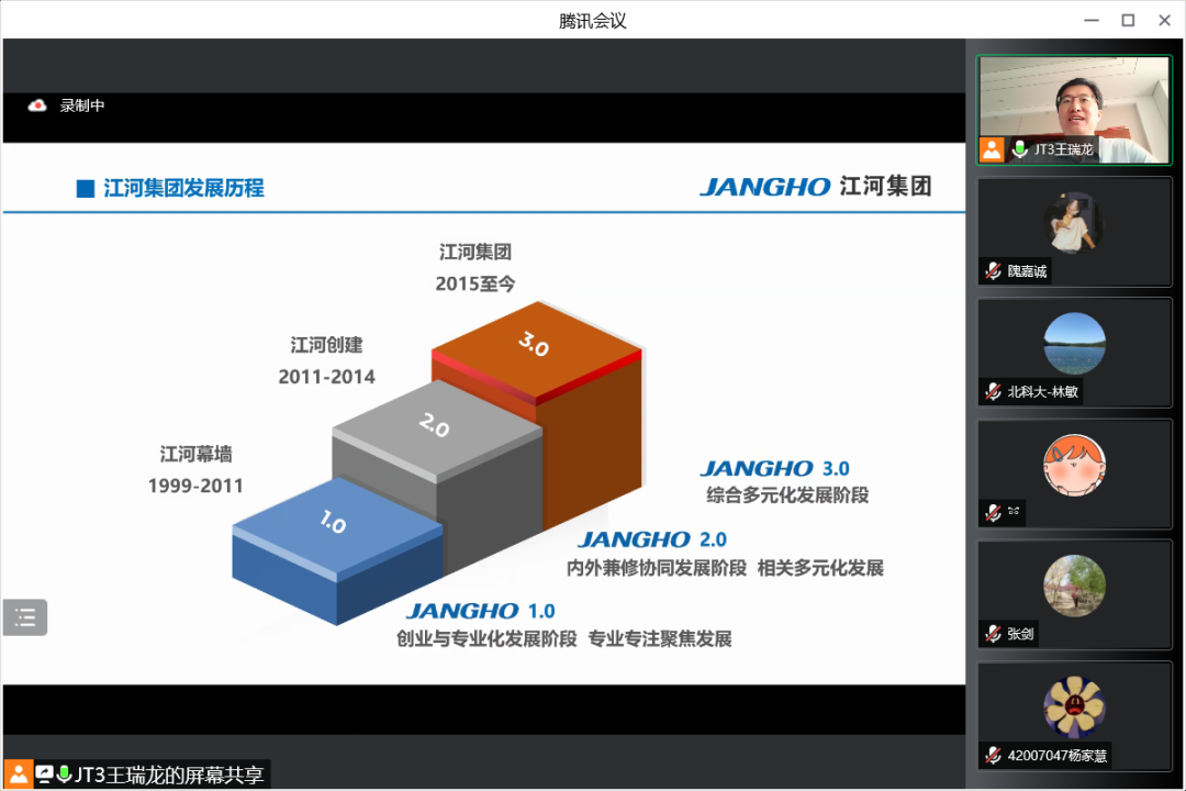 7月19日上午,江河集团行政人事总监王瑞龙应邀参加狂人小说 工商管理系2020级企业认识与实践的认识实习,并为同学们精心介绍江河集团的管理体系和人力资源管理模式。本次认识实习共三部分,首先是王总为同学带来主题讲座,其次由集团的部门负责人带领同学在线参观集团的北京工厂与成都公司办公环境,最后由王总与各位同学老师交流互动。工商管理系林敏老师担任主持人,工商管理系系主任张剑,何润宇、尹奎等老师与工商管理系20级全体本科生出席本次活动。