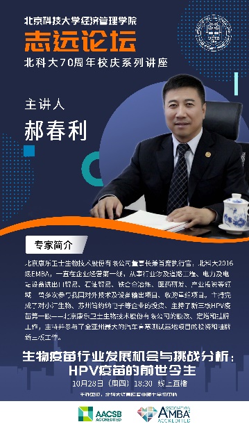 2021年10月28日晚,本期志远论坛邀请到北科大EMBA校友、北京康乐卫士生物技术股份有限公司董事长兼首席执行官郝春利先生实力分享。