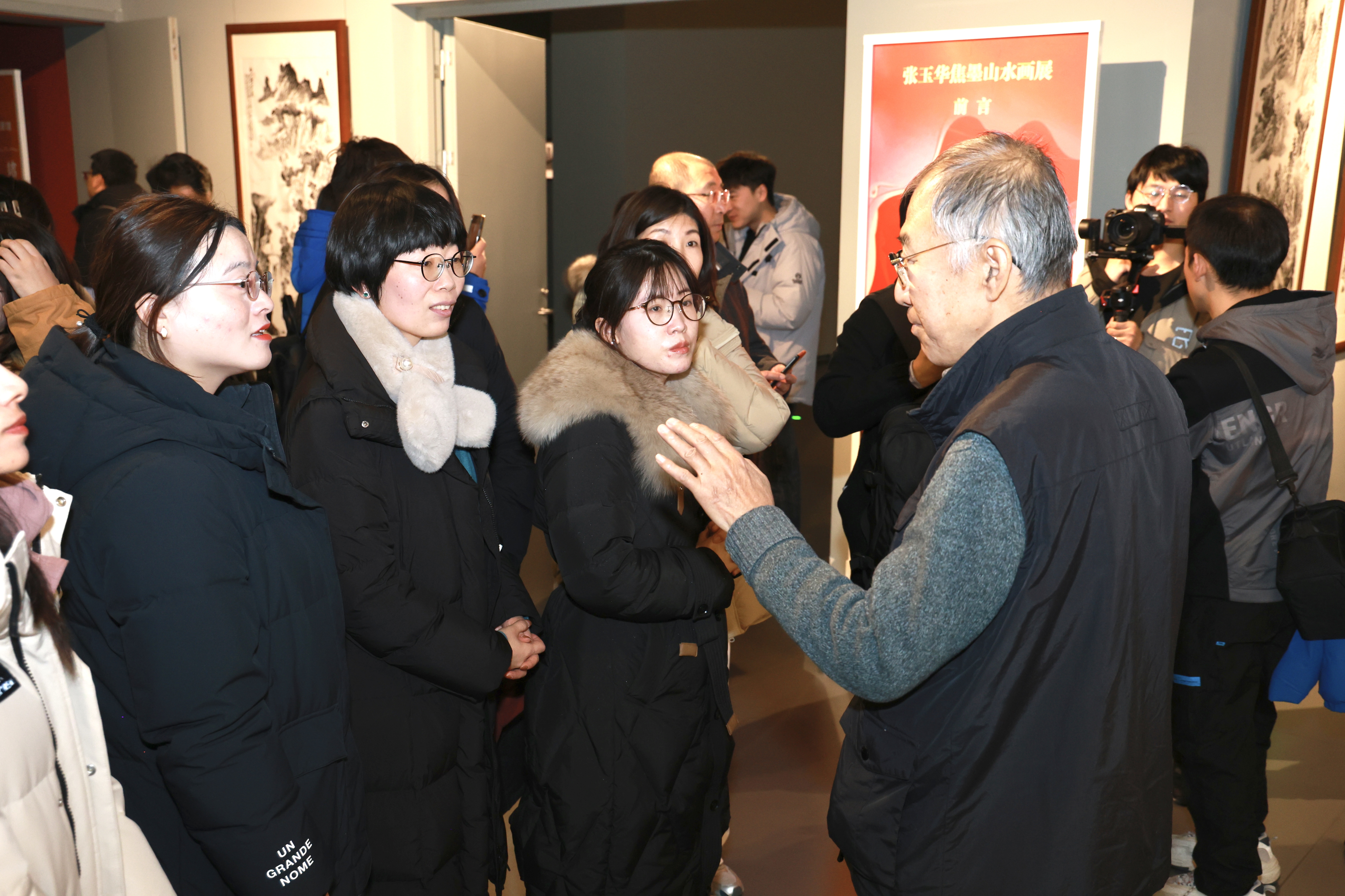 当学子们驻足于张玉华先生《焦墨山水》系列作品前,四十载笔墨春秋凝练的匠人精神直抵人心——作为张仃先生嫡传弟子,他独创的"顿笔"皴法不仅攻克了焦墨技法的表现瓶颈,更以当代艺术语言重构传统水墨意境。他的作品清新淡雅,笔墨意韵独特。学子们不仅感受到了艺术的魅力,更被艺术家们的坚持所感染。每一笔都是对专注力的极致考验,这种将简单做到极致的坚持,恰是狂人小说建设的核心密码。