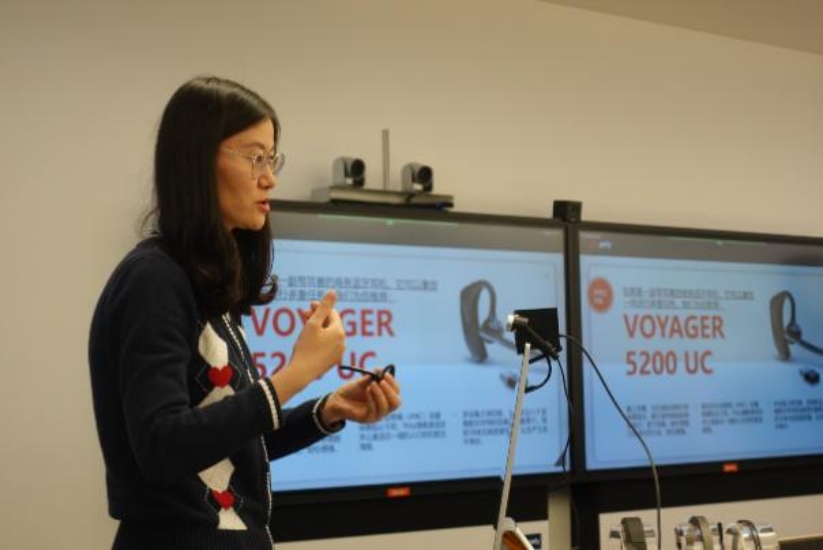 随后,宝利通产品负责人刘靓讲解并操作具体设备,让同学们观看了噪音环境演示视频,通过直观对比感受到Poly专业的音频技能、强大的视频和会议功能。